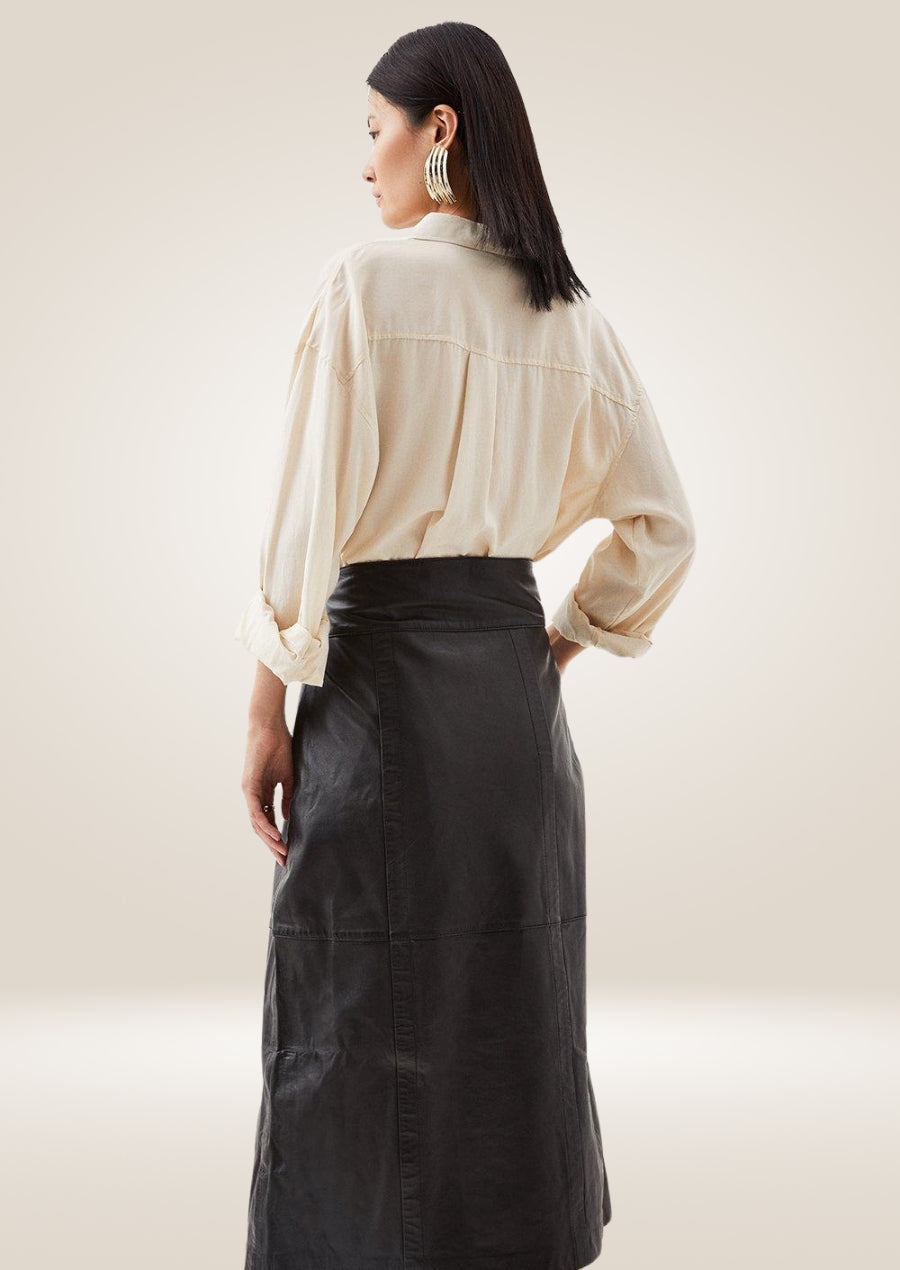 Designed to flatter and exude confidence, this pencil skirt is crafted from premium black leather, making it a versatile piece for office wear or evening outings.